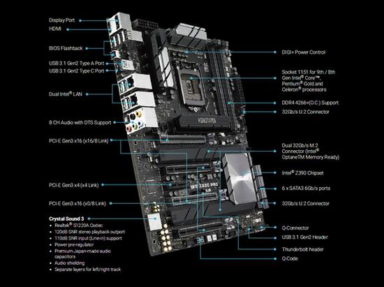 其他配置方面,ATX標準板型,10相供電,24針主供電接口和8+8+6針輔助供電接口,但散熱片并不算很夸張。四條DDR4內存插槽,最高頻率4266MHz,最大容量64GB。六個SATA 6Gbps,兩個M.2-22110 32Gbps(均覆蓋散熱片)、兩個U.2 32Gbps。
