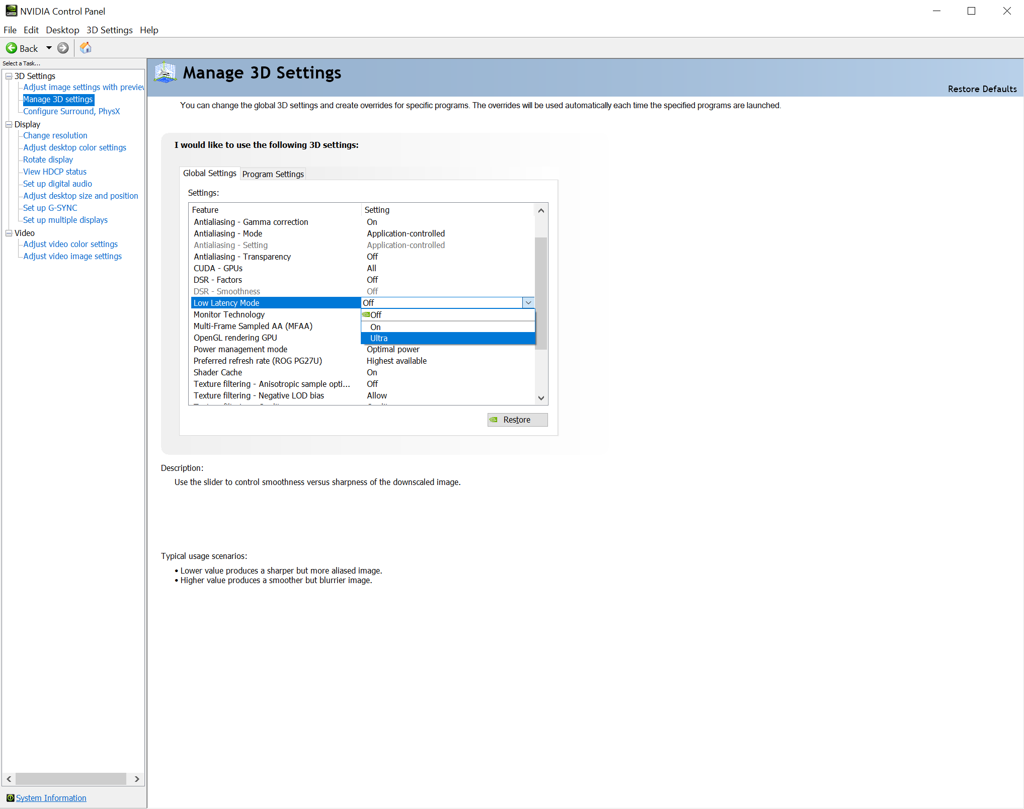AMD發(fā)布RX 5700系列的同時(shí)提出了Anti-Lag抗延遲技術(shù),NVIDIA有了類似的回應(yīng),在驅(qū)動(dòng)控制面板中增加了一個(gè)“低延遲模式”(Low-Latency Mode),可以選擇關(guān)閉(Off)、開啟(On)、超級(jí)(Ultra)三種模式。