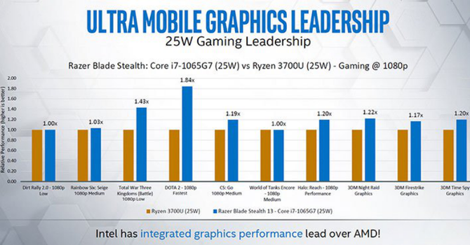 當然,最有意思的,應(yīng)該還是和AMD的處理器做比。眾所周知,AMD移動版處理器內(nèi)置的Vega核顯是擁有入門獨顯級別性能的,比此前英特爾的Gen 9核顯要強出不少,但是隨著Gen 11核顯的到來,情況似乎發(fā)生了逆轉(zhuǎn),根據(jù)官方給出的數(shù)據(jù)顯示,在1080P分辨率下,i7-1065G7(25W)在很多測試的游戲中都超越了采用Vega 10核顯的Ryzen 7 3700U(TDP同樣是25W),在《Dota 2》游戲中甚至有1.84倍的性能領(lǐng)先,最不濟也能保證持平。