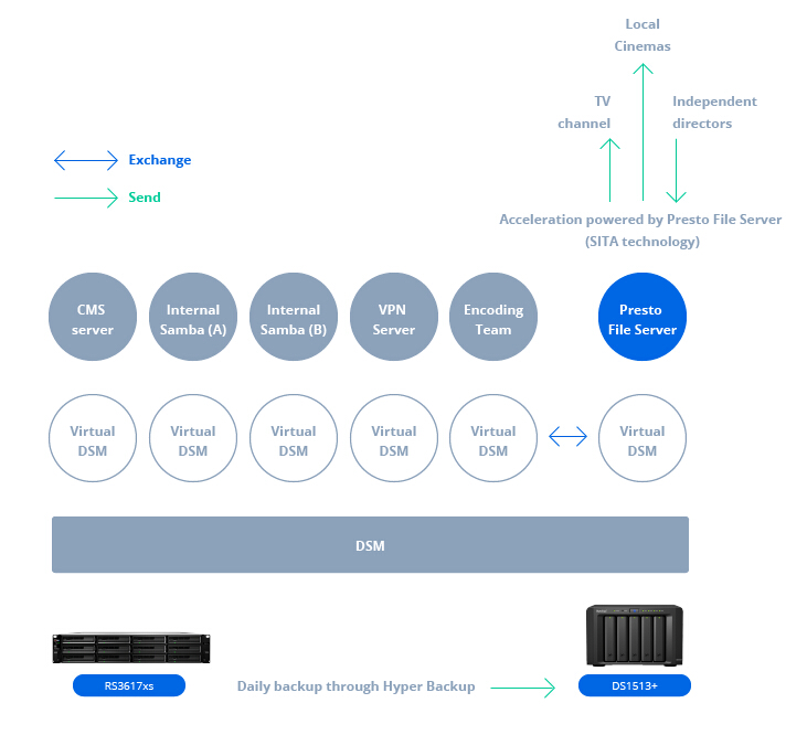 這一次,它購(gòu)買了 RS3617xs,以 12 塊 10TB HDD 組成了 RAID 6,隨后針對(duì)設(shè)備上運(yùn)行的 Virtual DSM 構(gòu)建了 6 個(gè)完全隔離的虛擬實(shí)例,用于 所需要的不同用途,每個(gè)實(shí)例配備自己的 VLAN,以滿足 MPAA(美國(guó)電影協(xié)會(huì))對(duì)不同設(shè)備的不同網(wǎng)絡(luò)可訪問(wèn)性的安全規(guī)定。