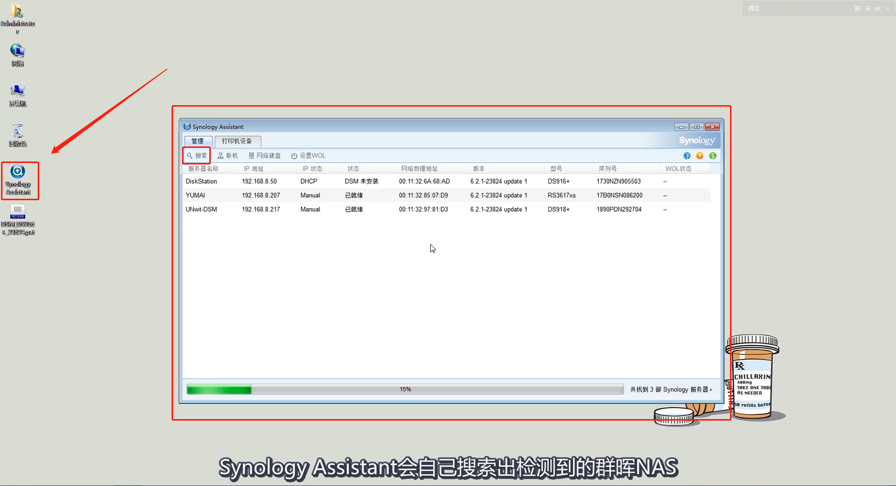 先按照平時(shí)安裝新軟件,安裝好群暉 Synology Assistant 之后,打開 Synology Assistant 軟件掃描同網(wǎng)絡(luò)內(nèi)的群暉 NAS網(wǎng)絡(luò)存儲(chǔ)設(shè)備。