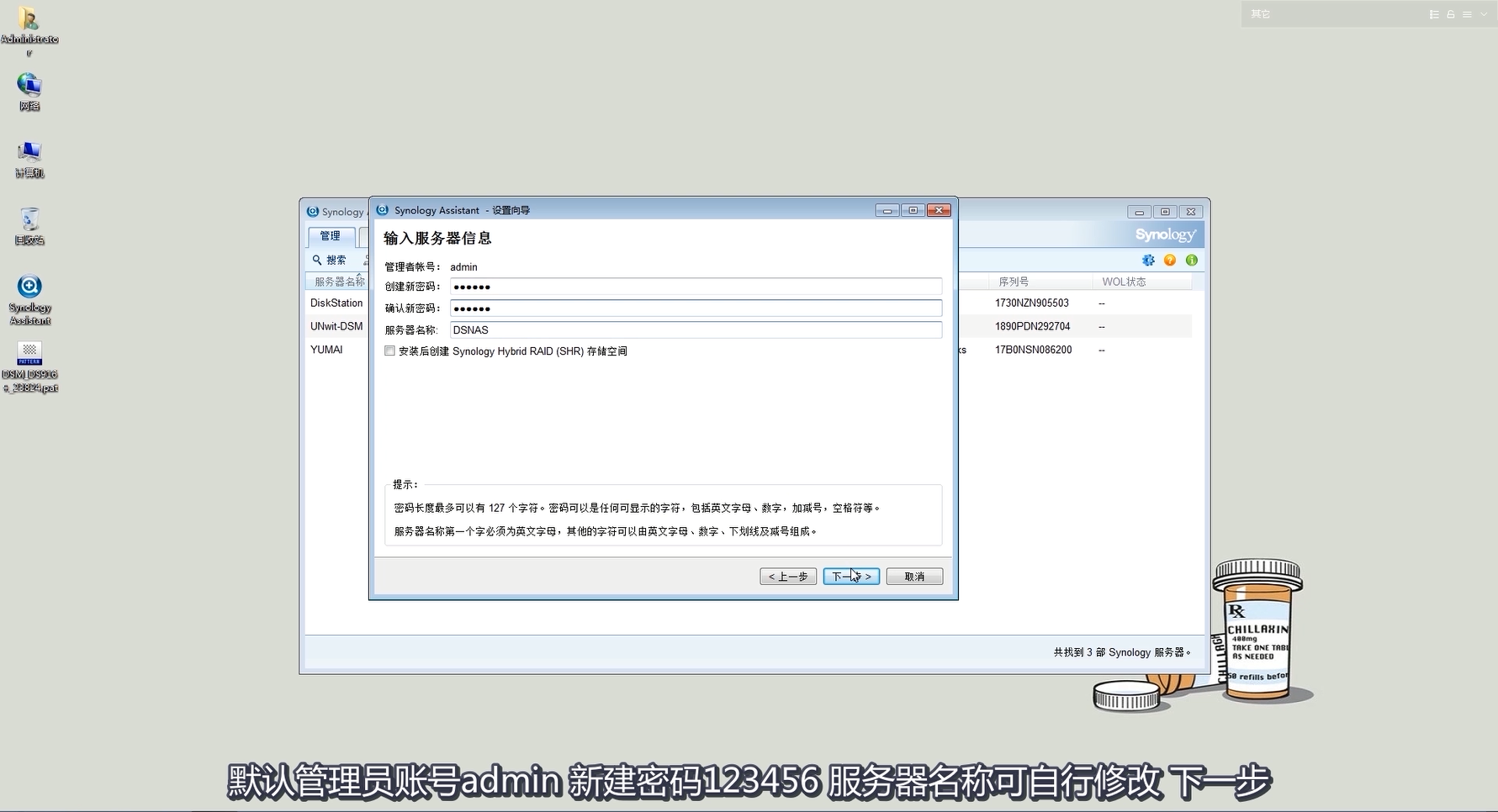 下一步,輸入管理員的密碼,可以根據(jù)自己需要修改服務(wù)器名稱,這里不改后面也可以在系統(tǒng)里面修改。先不要勾選安裝后創(chuàng)建 Synology Hybrid RAID (SHR)存儲(chǔ)空間,太耗費(fèi)時(shí)間,有些用戶需要用 RAID 5或者其他陣列。