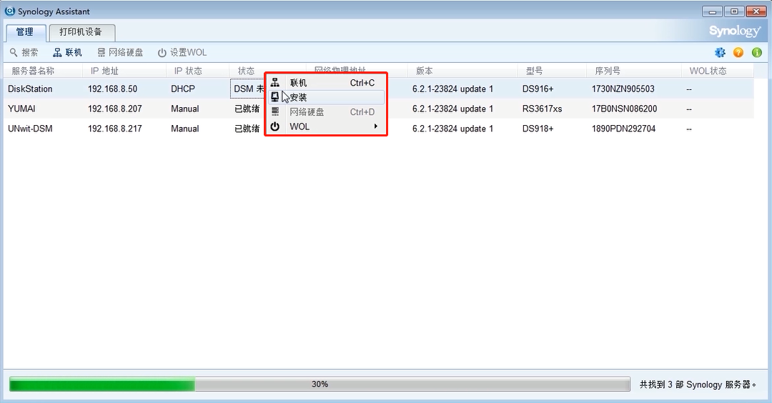 找到之后右鍵那個(gè)DSM未安裝的機(jī)器選擇安裝。